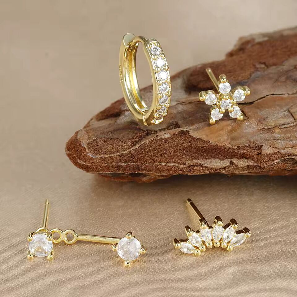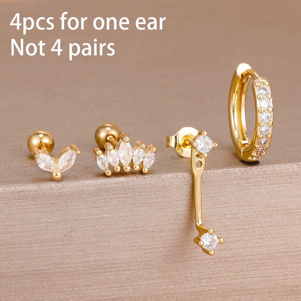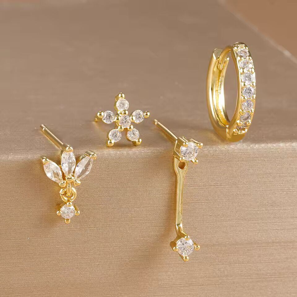 【送料無料◎】 4 個ステンレス鋼サークルハギーフープイヤリングセット女性のためのゴールドカラーのユニークなジルコンフラワースタッドイヤリングピアスジュエリー