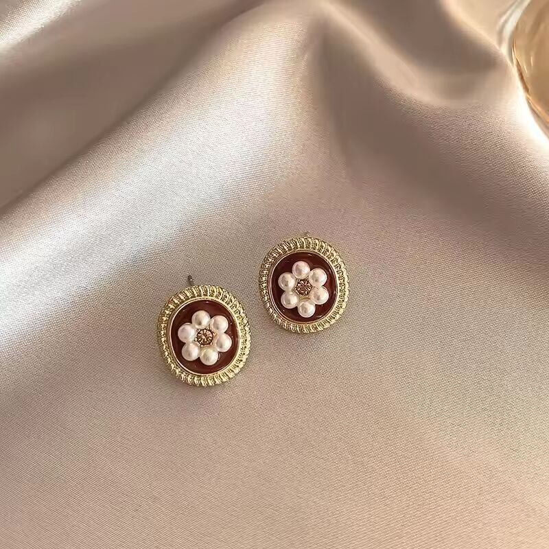 【送料無料◎】 ヴィンテージ滴るオイルワインレッドレトロスタッドピアス女性のための韓国真珠の花ハート形の幾何学的なイヤリングハイセンスジュエリー