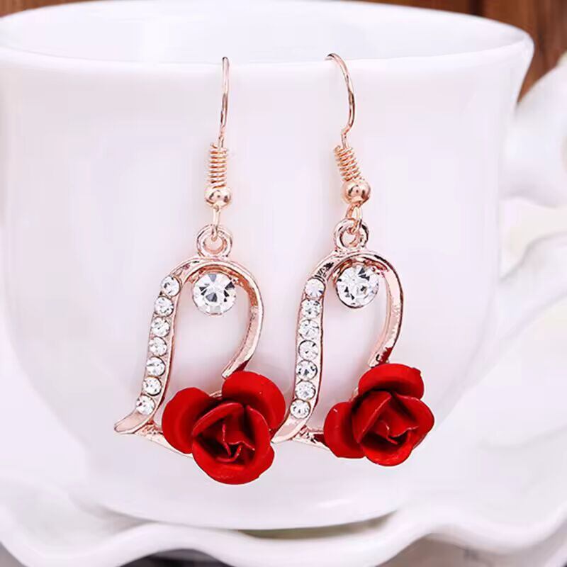 【送料無料◎】 新しいファッションジュエリーレッドローズドロップイヤリング女性ヴィンテージラインストーン花ブラブライヤリング結婚式婚約パーティージュエリー