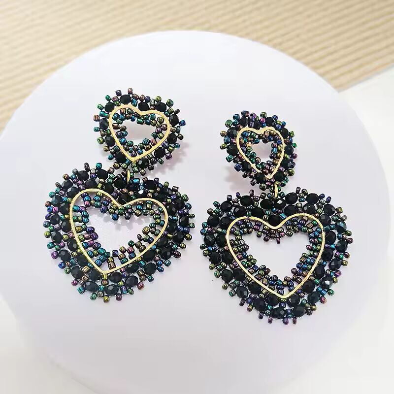 【送料無料◎】 Kaseakia ボヘミアン ボヘミアン ブラック ハート ビーズ ダングル イヤリング、ビッグ ラージ ヴィンテージ ハンドメイド シード ビーズ ドロップ イヤリング 女性用