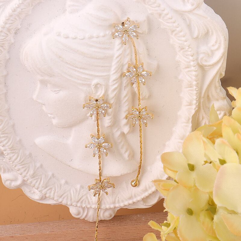 ◎【送料無料】フラワー ピアス チェーンピアス クリア ロング 揺れ 花 K14ゴールド 浴衣 ゆかた レディース 大人っぽい