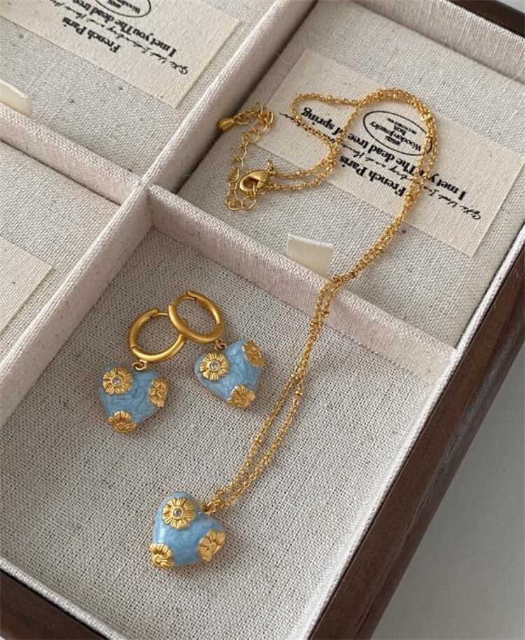 おしゃれを楽しむ女性の日常にぴったりな、フランス風レトロ珐琅滴油ピアス&ネックレスセットです。ネックレス38.5cmは長さが調整しやすく、鎖骨元や首元に自由にフィットさせられ、ピアス3×1.5cmは小巧で可愛らしく、耳元を華やかに飾ります。珐琅滴油仕上げで質感があり、ブルーの鮮やかさがラグジュアリーな雰囲気を演出し、花朵とハートのモチーフがレトロな甘さを添えます。パーティーや記念日のおしゃれはもちろん、日常の買い物や散歩にも着けられ、着けるだけでおしゃれ度がアップします。細やかなデザインで過度な装飾を避け、優雅さと可愛らしさを兼ね備え、毎日のおしゃれを簡単に実現できるアイテムです。∽注意事項∽