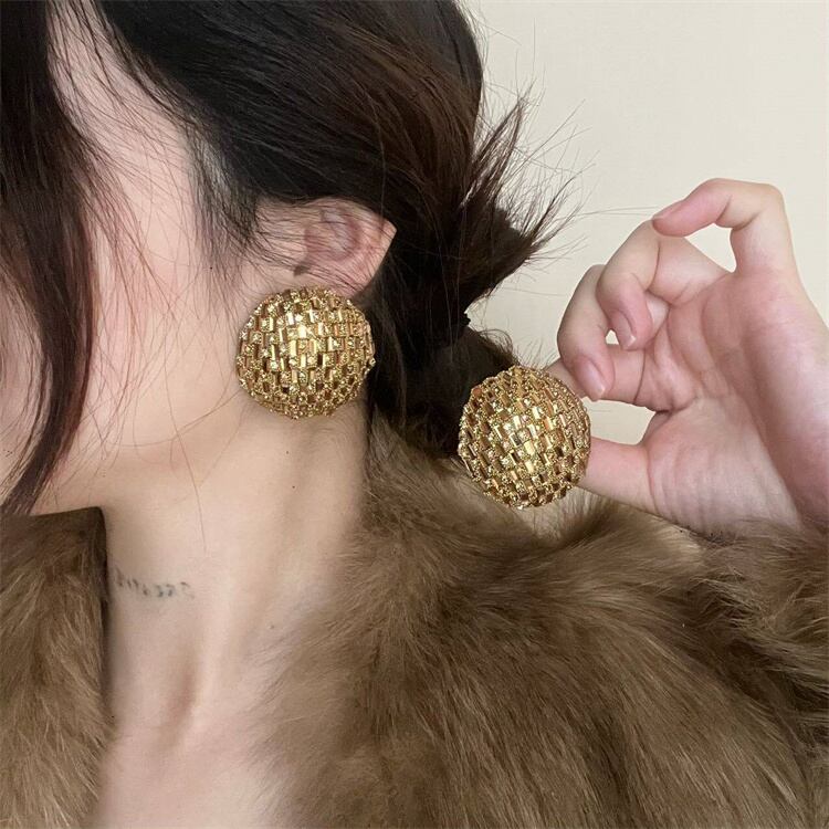 ◎【送料無料】3色展開 全面ラインストーンの半球形ピアス レトロジオメトリックデザイン大ぶりイヤートリム(約4cm)