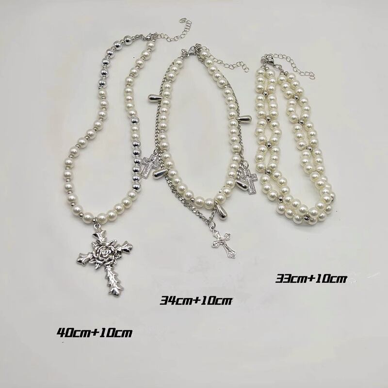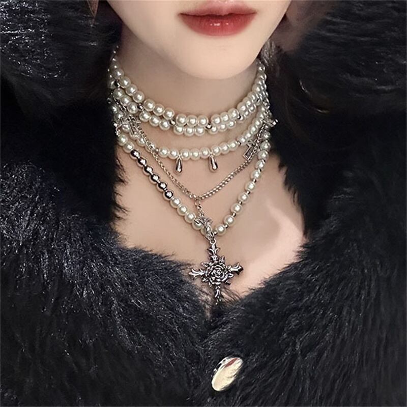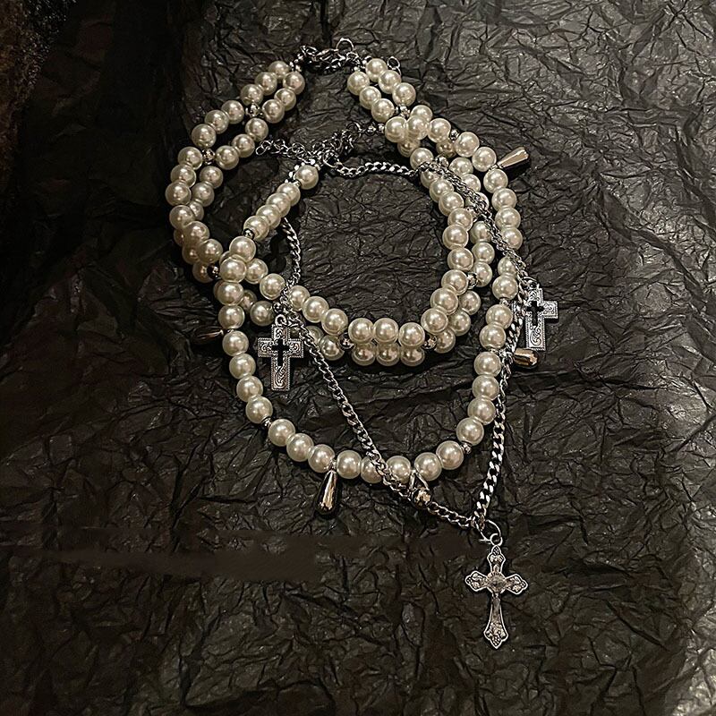 ◎【送料無料】パール 十字架 ネックレス 二重 アクセサリー 個性 レディース 設計感 ファッション 上品