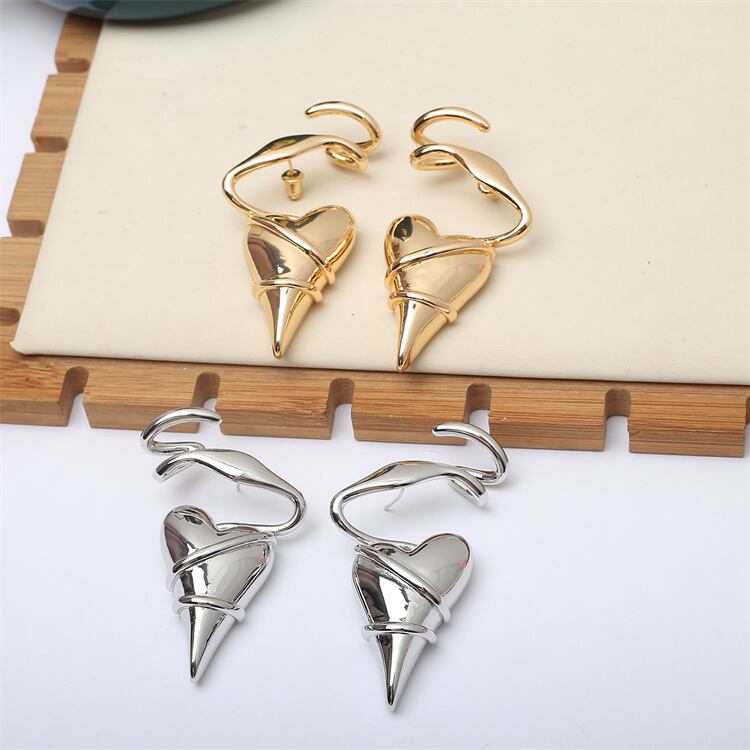 先端尖りハート 金属リボン巻き込み 欧米風イヤスタッド 個性的アクセサリー デート・パーティーにぴったり