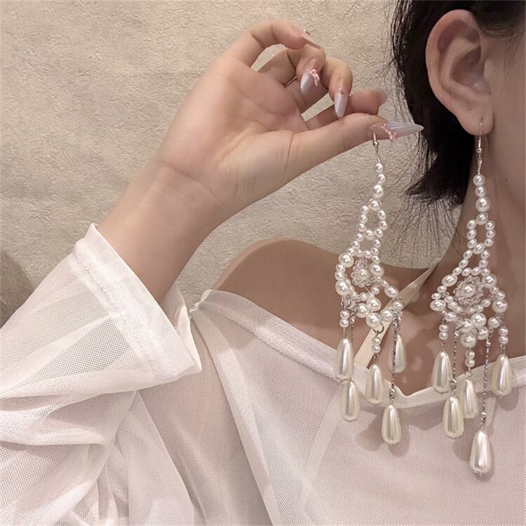 珠玉の流れる宮廷風 真珠フリンジピアス イヤフック 特別な日のプレゼント ロングアクセサリー