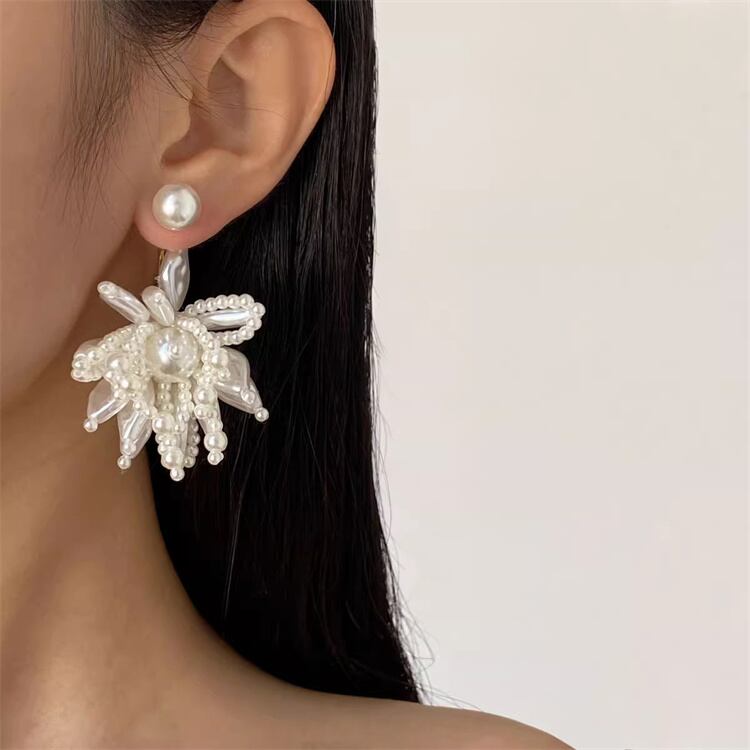 ◎【送料無料】ハンドメイドビーズの貝殻花 2WAYタイプ 華やかイヤジュエリー 結婚式用