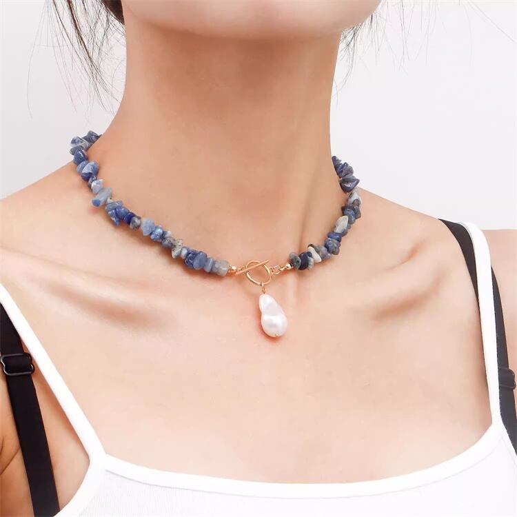 ◎【送料無料】欧米風ネックレス 異形真珠×ブルー松石 大サイズOTクリップ 気品ある日常着用アクセサリー