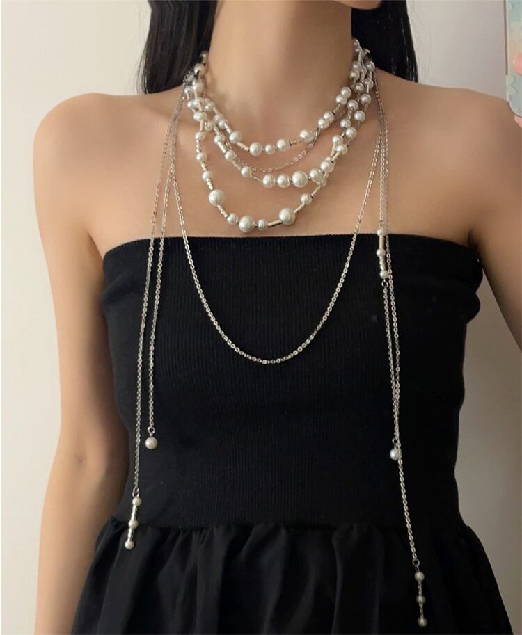 上品な雰囲気 多層模造真珠ロングチェーン 重ね付けスタイル