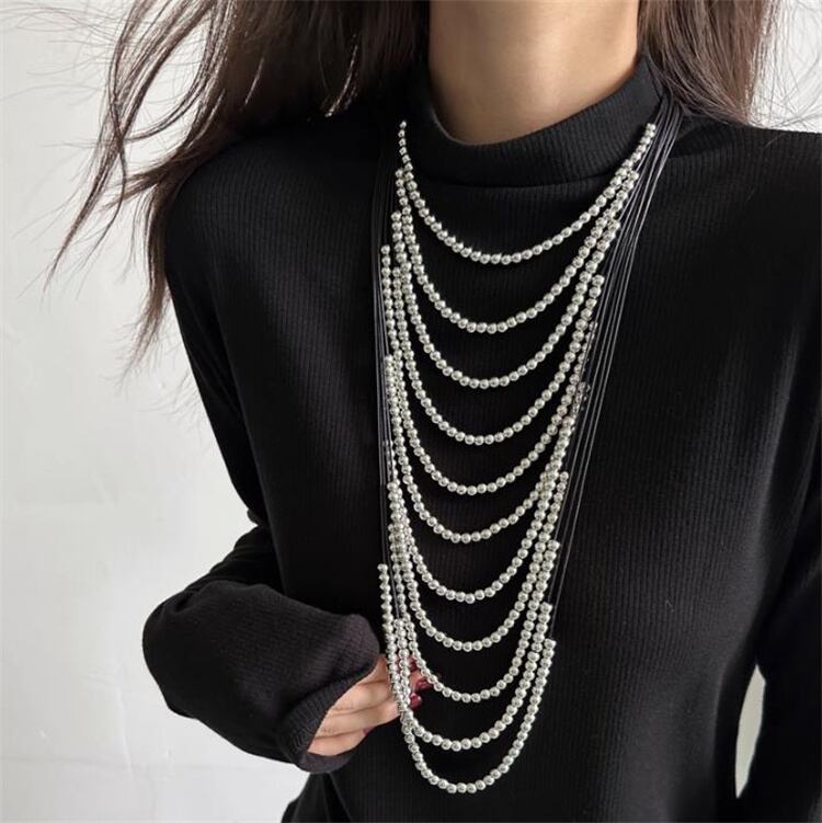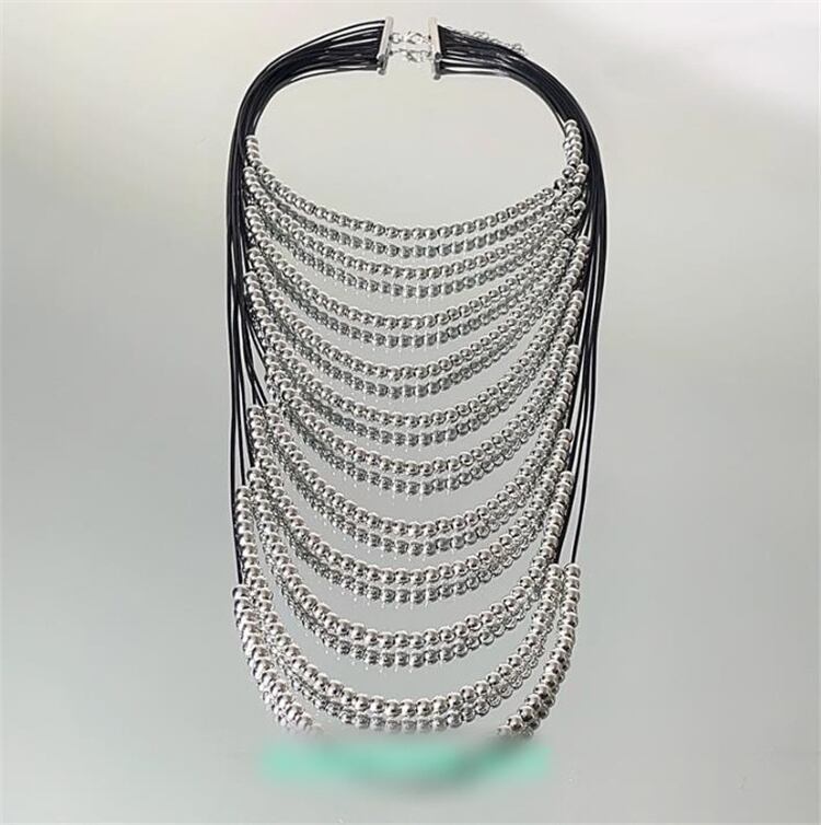 欧風スタイル ビーズ多層ロングネックレス レザーーディテール 鎖骨に映えるデザイン
