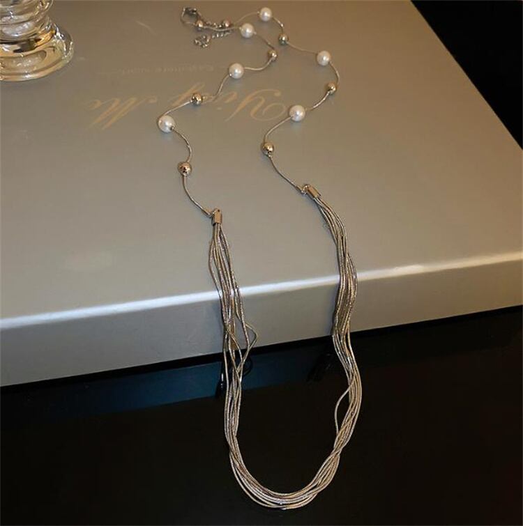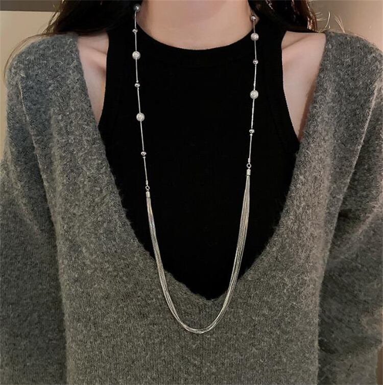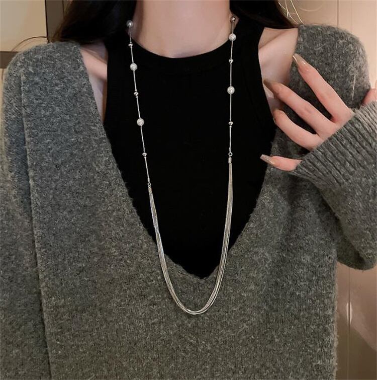 2025年トレンドのロングパールネックレスが遂に登場;毛糸やカットソーに合わせるだけで、首元がパッと華やぐ優れもの;1本で3通りの長さに変化!通勤からデートまで、シーン問わず活躍するマストアイテム