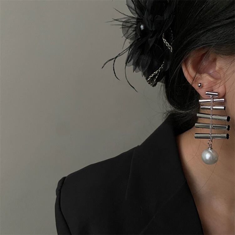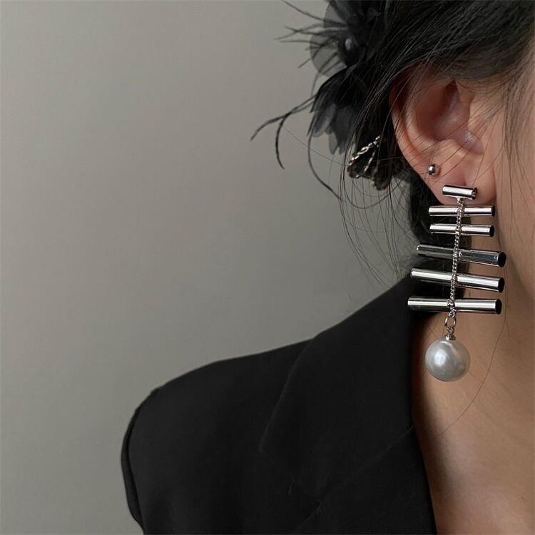 層状デザイン 金属パイプ 大粒フェイクパール オーバーサイズピアス