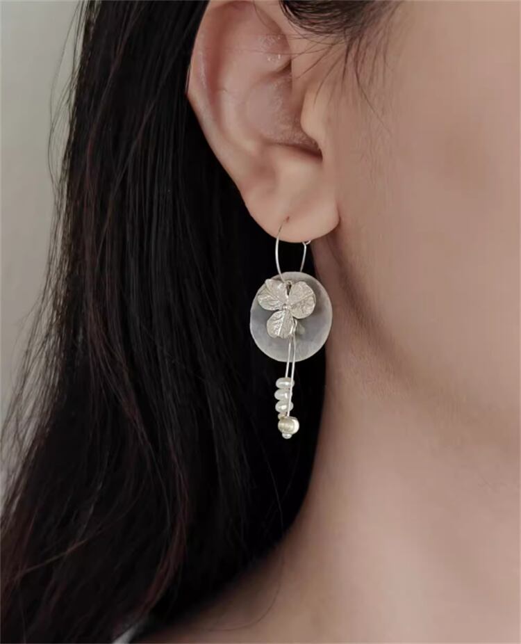S925スターリングシルバー 真珠貝デザイン フリンジホップ ピアス
