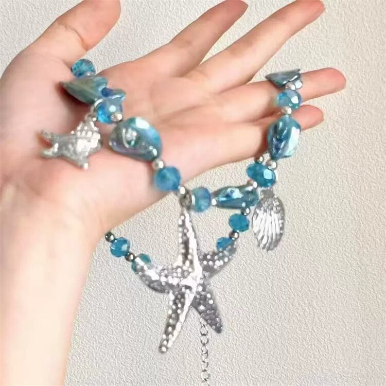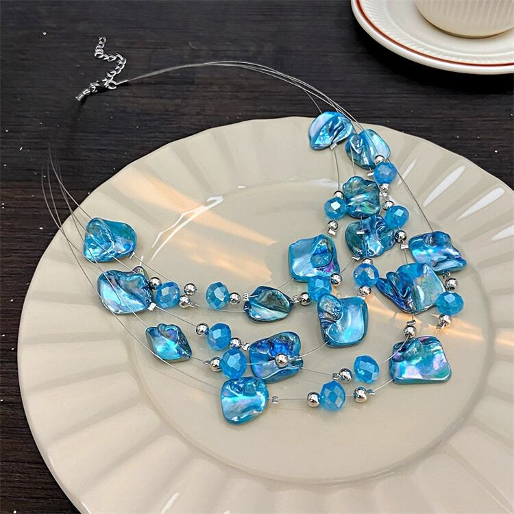 個性派ネックレス 多層天然石&貝殻チェーン 大ぶりロックスタイル 鎖骨強調アクセ