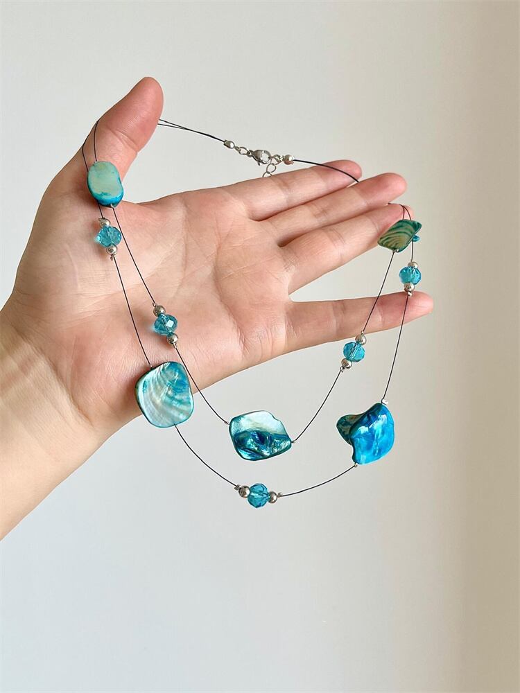 個性派ネックレス 多層天然石&貝殻チェーン 大ぶりロックスタイル 鎖骨強調アクセ