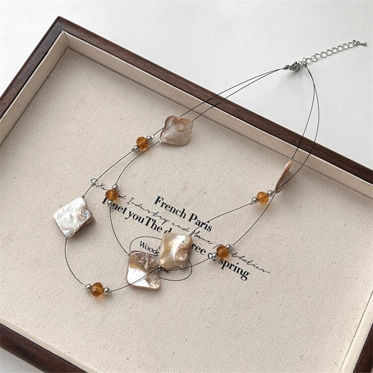 ◎【送料無料】個性派ネックレス 多層天然石&貝殻チェーン 大ぶりロックスタイル 鎖骨強調アクセ