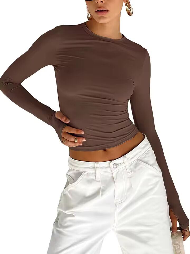 【送料無料◎】 ファッション女性 Tシャツ長袖クルーネックソリッドスリムフィットレディースクロップトップ親指穴付きデイリーストリート夏キャミソール