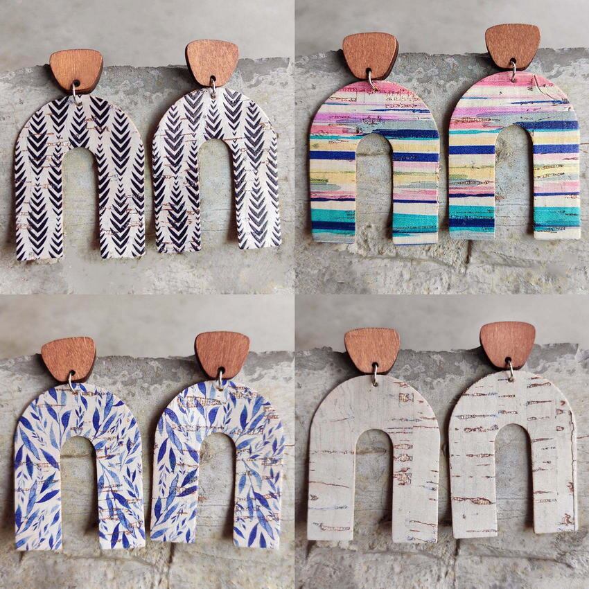送料無料 ウッドとアーチコルクレザーイヤリング女性ストライプ葉プリント U 字型コルクステートメントイヤリングブティックジュエリー 指輪 AE3321100805908181171