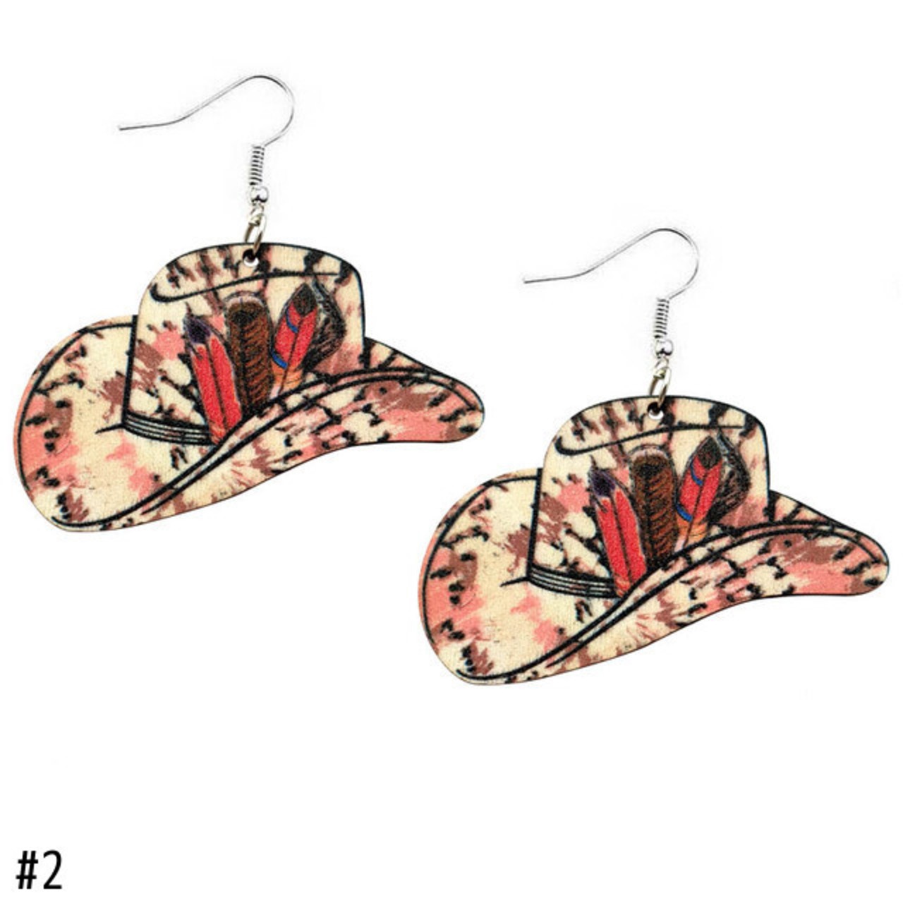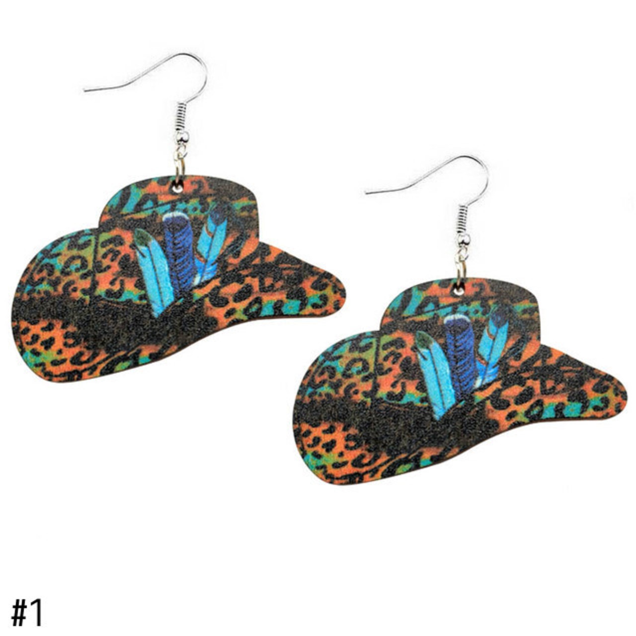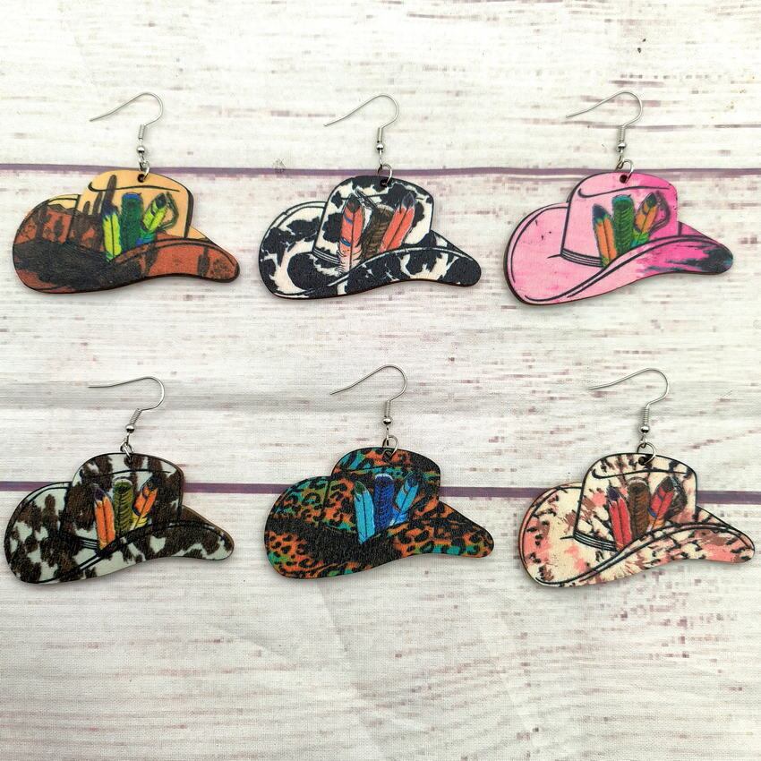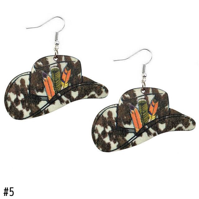 送料無料 ヒョウ牛革フェザープリント木製カウボーイハットイヤリング女性サボテンロデオウッドイヤリング西洋ジュエリー 帽子 指輪 AE3321100806090466709