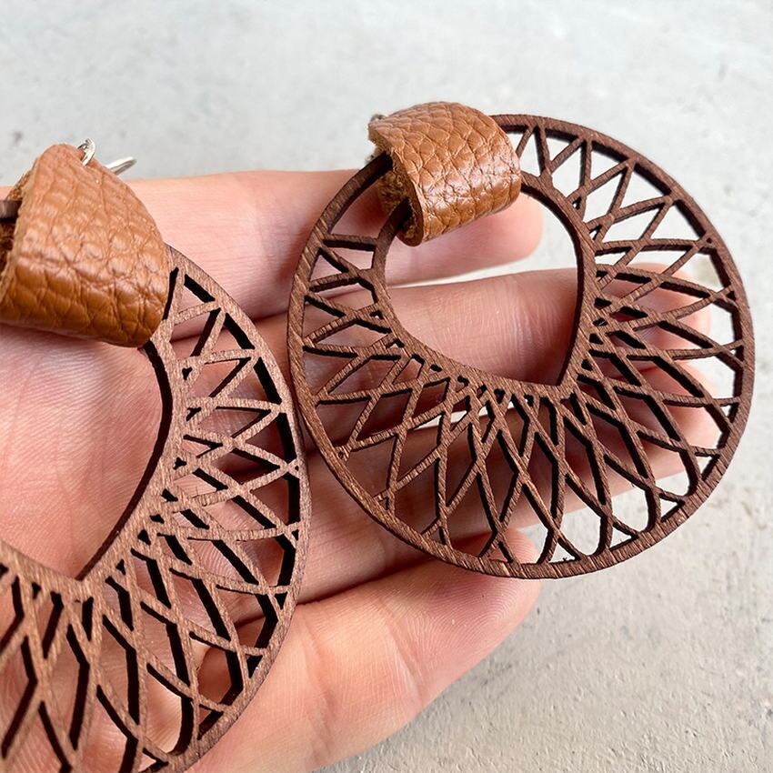 送料無料 ブラウン レザー ラップ カットアウト ウッド アロー イヤリング レディース ステートメント メッシュ パターン ウッド イヤリング 指輪 AE33211008079530227241