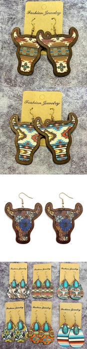 送料無料 プリント花柄アステカ柄木製牛ヘッド ブラブラ イヤリング女性トレンディな西洋木製ベゼル イヤリング 指輪 AE33211008013595010030