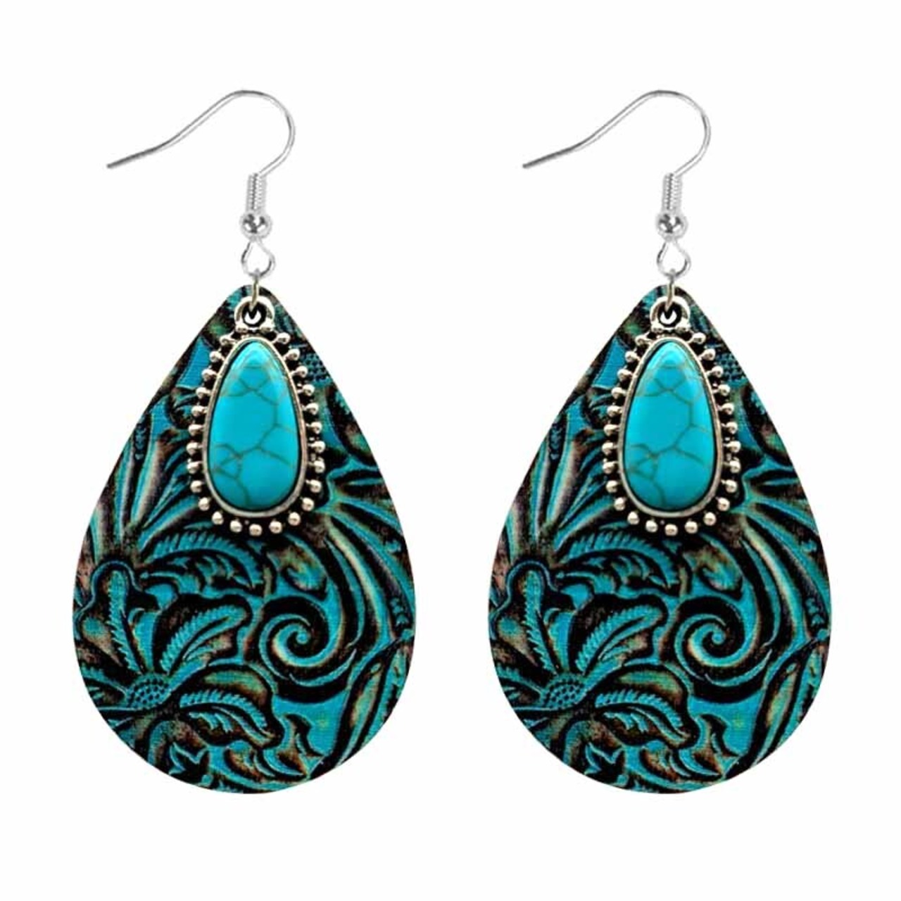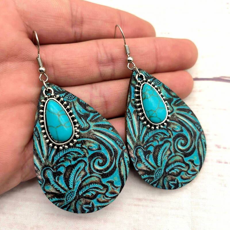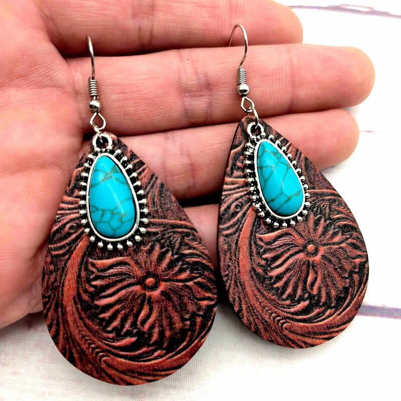 送料無料 フラワーエンボスレザープリントパターンウッドとターコイズティアドロップイヤリング女性ウエスタンカウテクスチャギフト 指輪 フラワーデザイン AE33211008059641144177