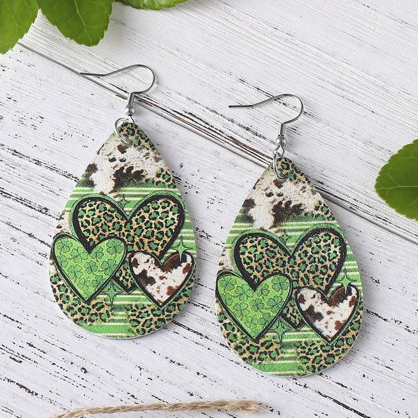 送料無料 両面プリント PU レザー聖パトリックの日イヤリング女性グリーンヒョウシャムロックハートプリントラッキークローバーイヤリング 指輪 AE33211008091266850476