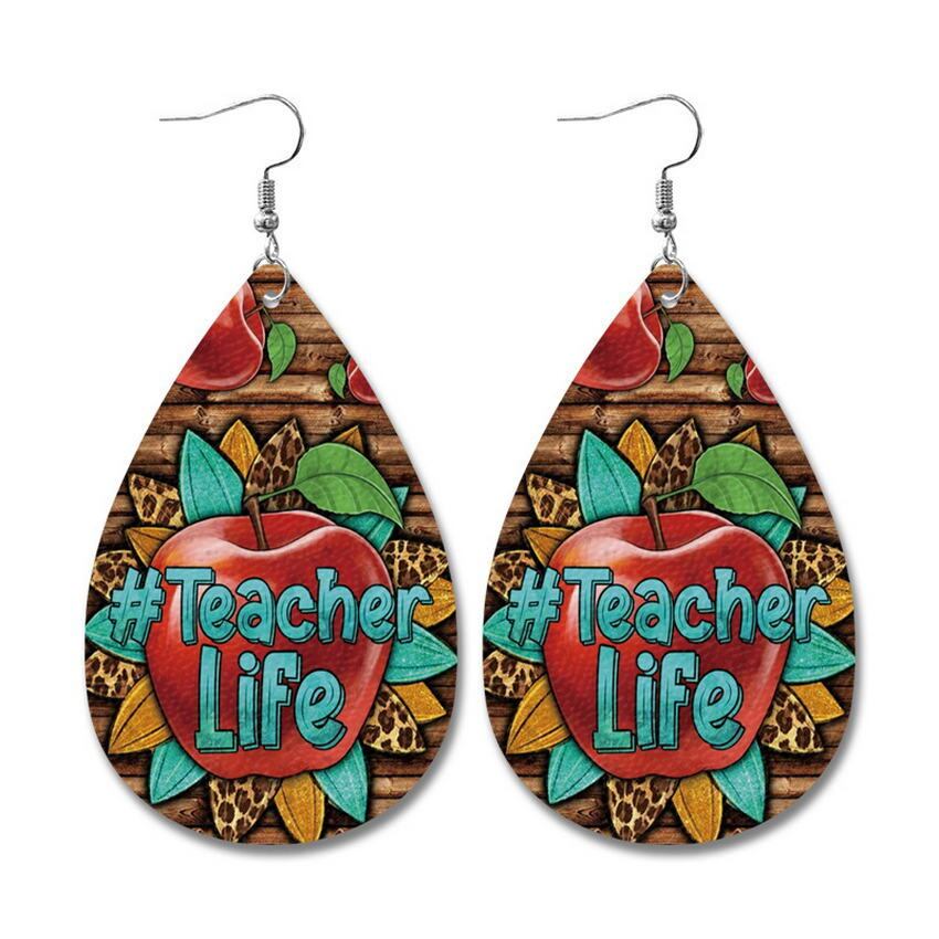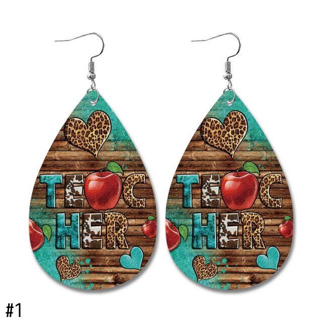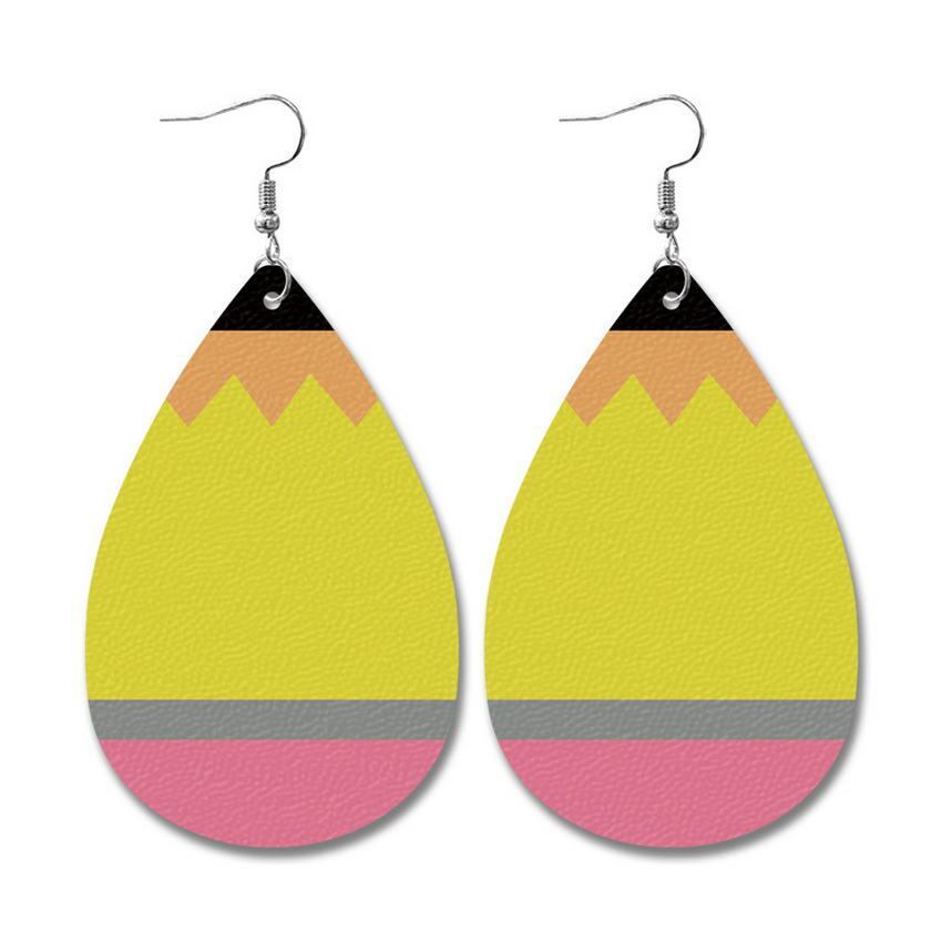 送料無料 鉛筆アップルプリント PU レザーティアドロップ教師イヤリング 2023 新学期教師の日ギフト 指輪 AE33211008095928207859