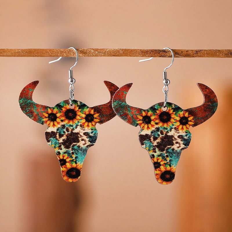 送料無料 ターコイズ ヒョウ ヒマワリ プリント ウッド ブル カウ ヘッド イヤリング レディース ウェスタン キャトル イヤリング カウ ジュエリー 指輪 フラワーデザイン AE3321100806737383204