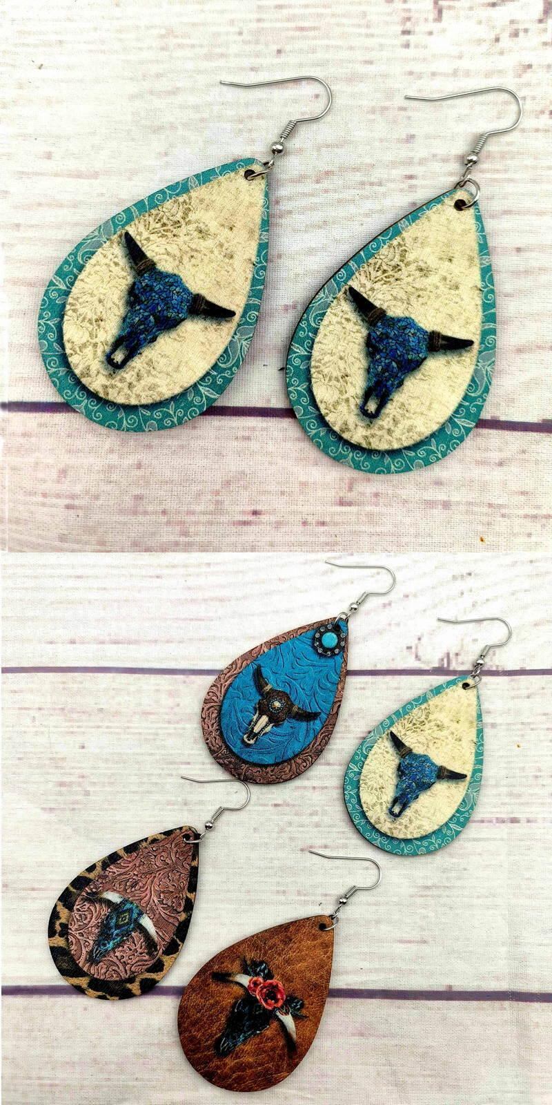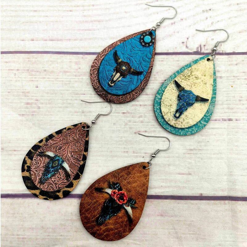 送料無料 西洋テクスチャターコイズフラワープリント牛ヘッドプリントヒョウウッドウォーターイヤリング女性牛イヤリング 指輪 フラワーデザイン AE33211008034393773467