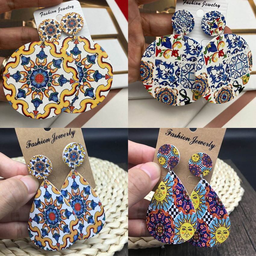 送料無料 ボヘミアン エスニック チャーチ セラミック パターン ステートメント イヤリング ヴィンテージ 木製 ビッグ ラウンド 水 ポルトガル タイル イヤリング レディース 指輪 ビンテージ AE33211008071741290115