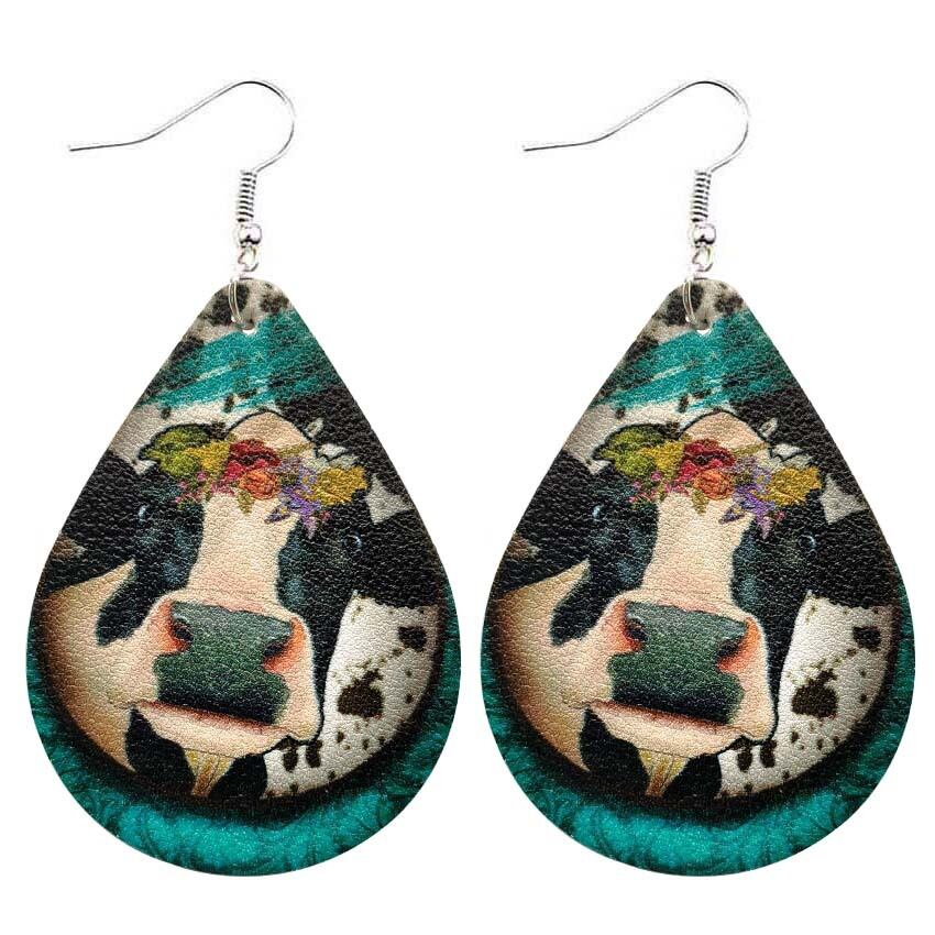 送料無料 ウェスタンファームアニマルヒョウ牛 PU レザーティアドロップイヤリング女性 2023 牛ジュエリー 指輪 AE33211008050996375386