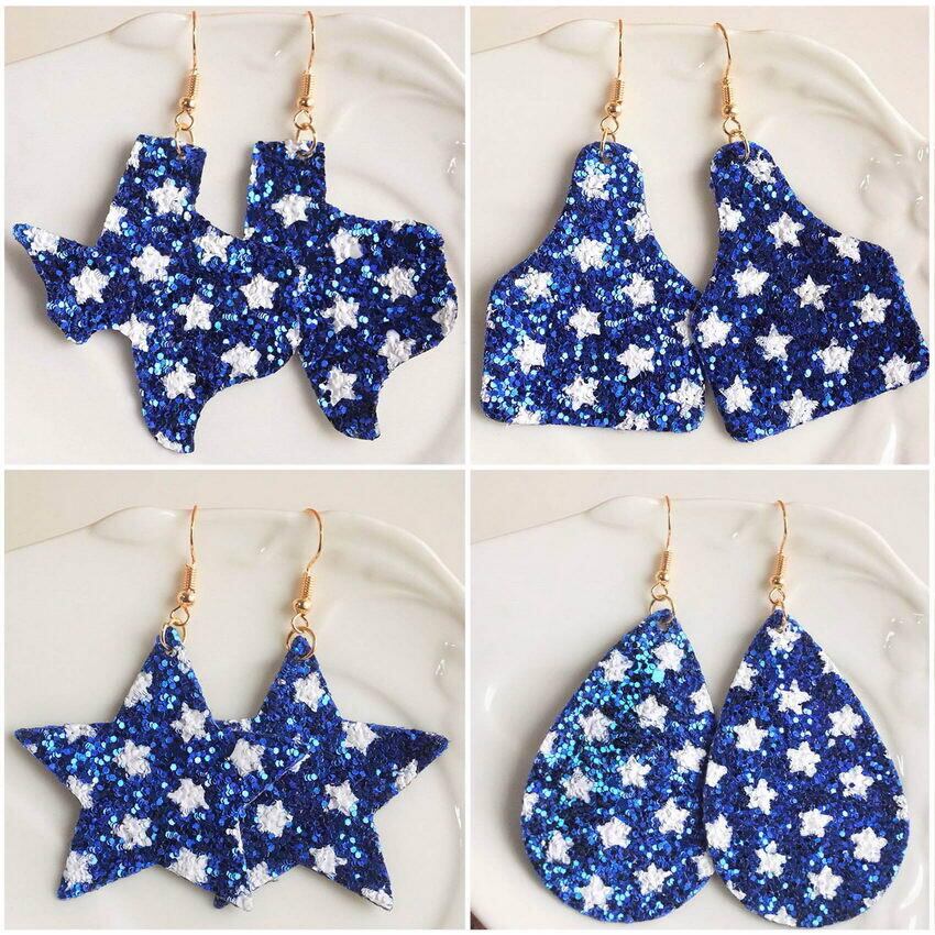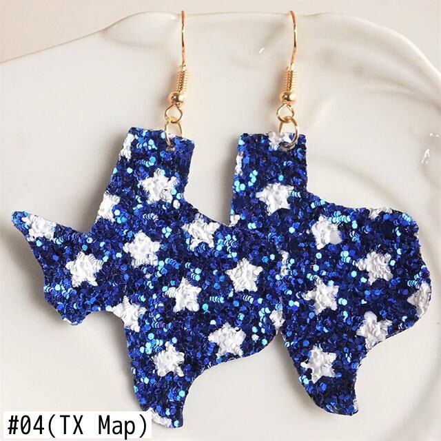 送料無料 舗装スターブルーグリッターレザー牛牛耳タグイヤリング女性テキサスマップイヤリング米国独立記念日ジュエリーコレクション 指輪 AE33211008034583781000