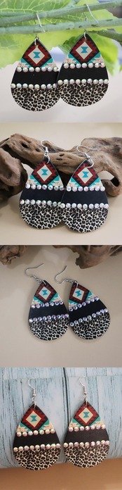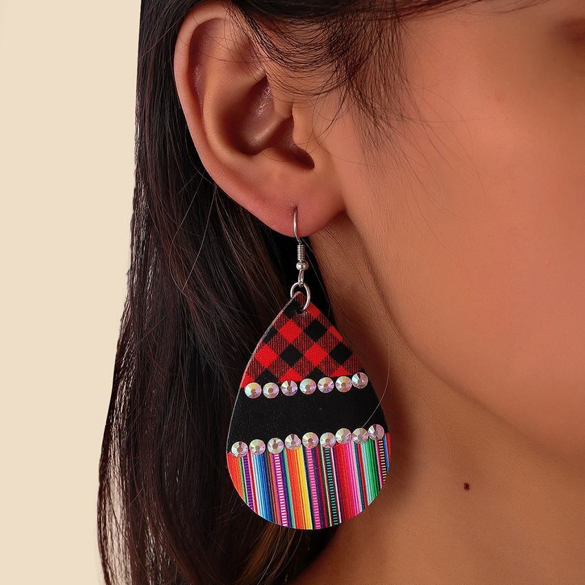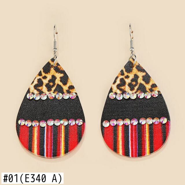 送料無料 ABクリスタル装飾レインボーストライプヒョウレザーティアドロップイヤリング女性バッファローチェック柄レザーイヤリング 指輪 AE33211008076399576062