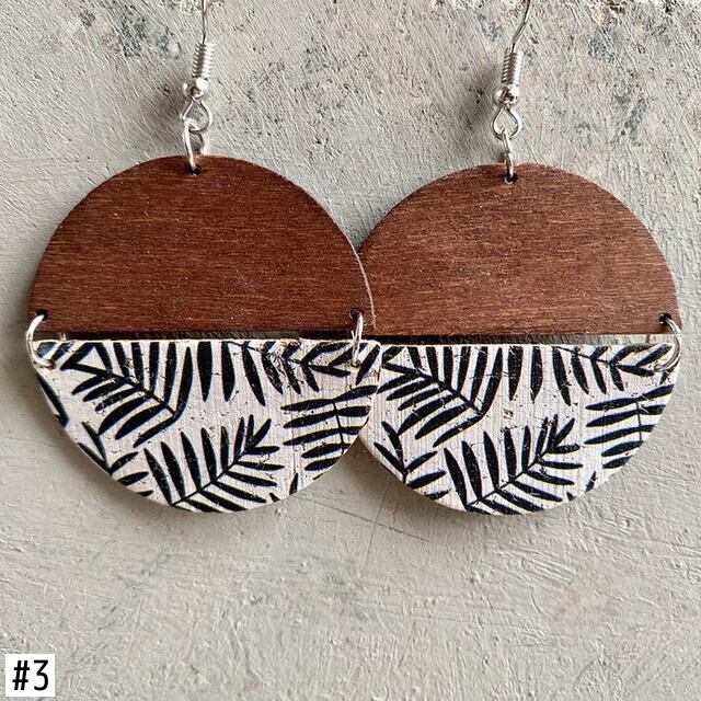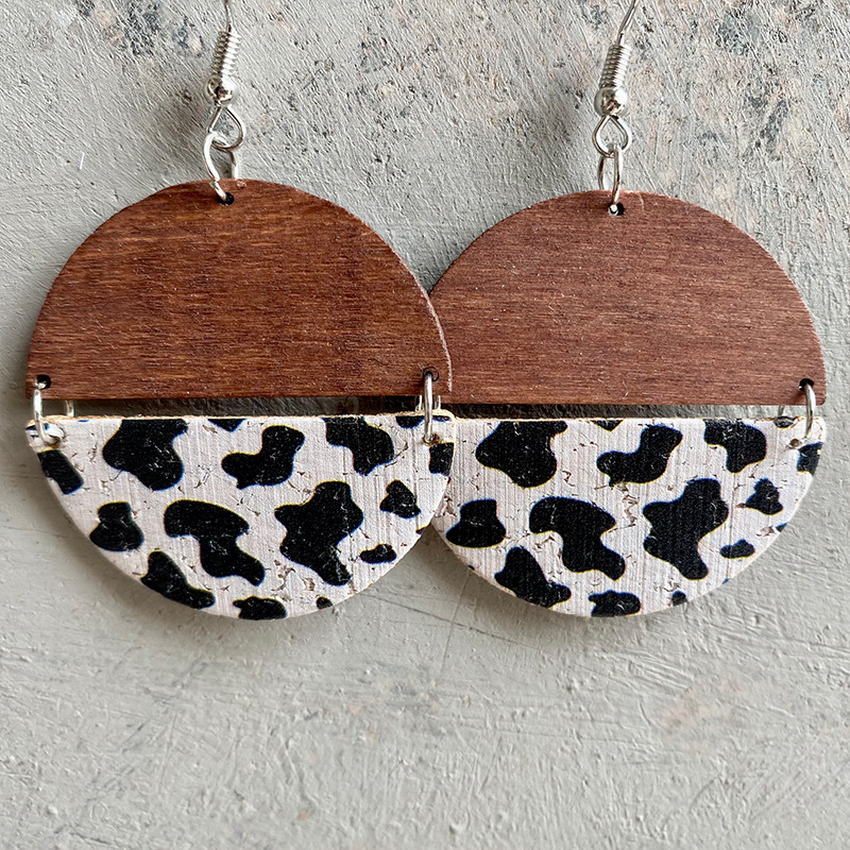 送料無料 木材とコルクスプリットサークル幾何イヤリング女性 2 色ヒンジ付きフラットディスク黒、白牛牛プリントイヤリングジュエリー ホワイト ブラック 指輪 AE33211008095598603911