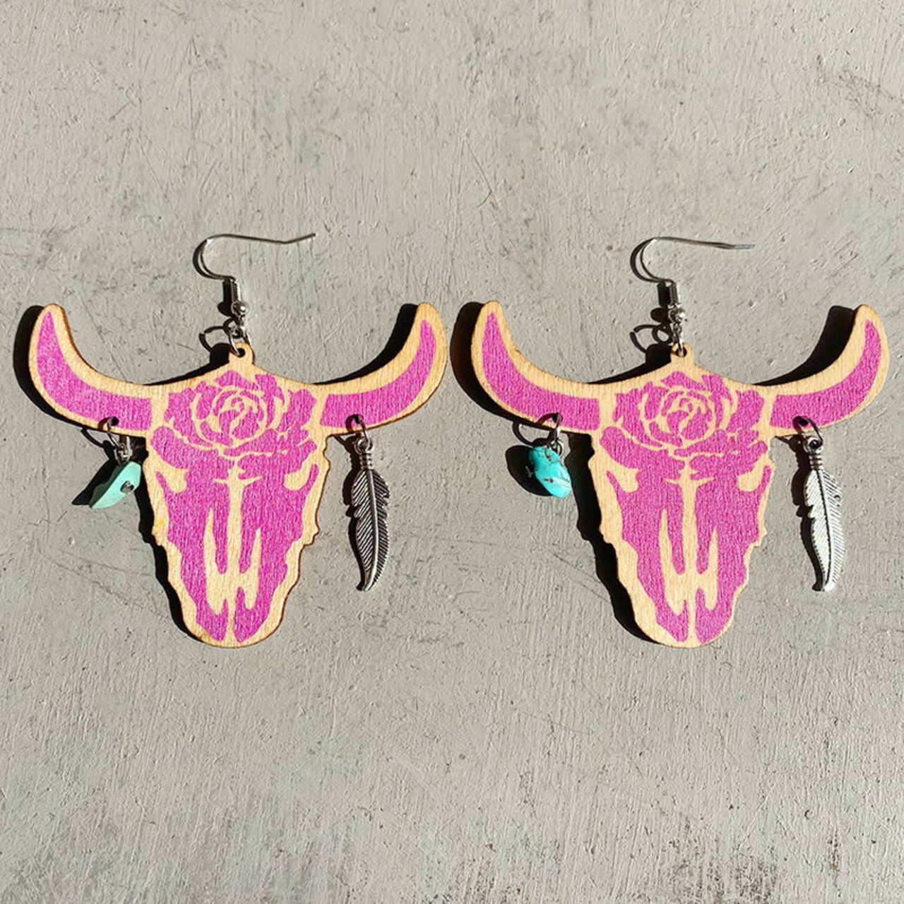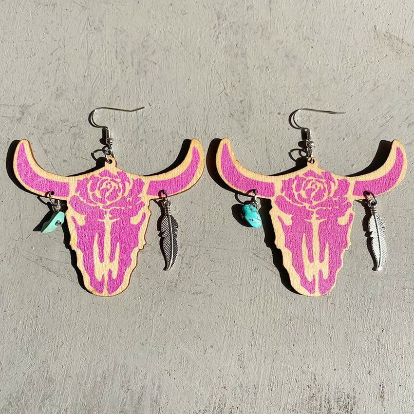 送料無料 自由奔放に生きる木製雄牛スカル イヤリング 2022 ウエスタン ジュエリー ターコイズと金属の羽の装飾アニマル トライバル イヤリング 指輪 AE33211008026085689368