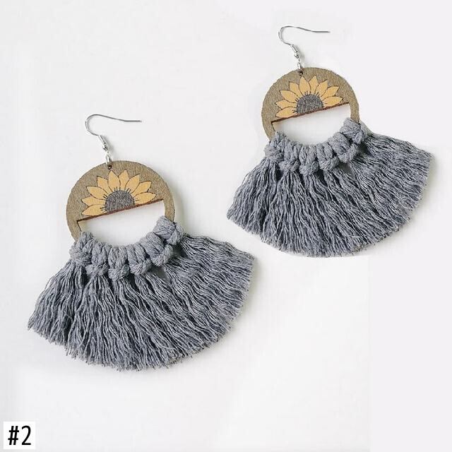 送料無料 ひまわりプリント木製コットンフリンジ電話マクラメイヤリング女性ブティックボヘミアンジュエリーギフト 指輪 フラワーデザイン AE33211008058322690158