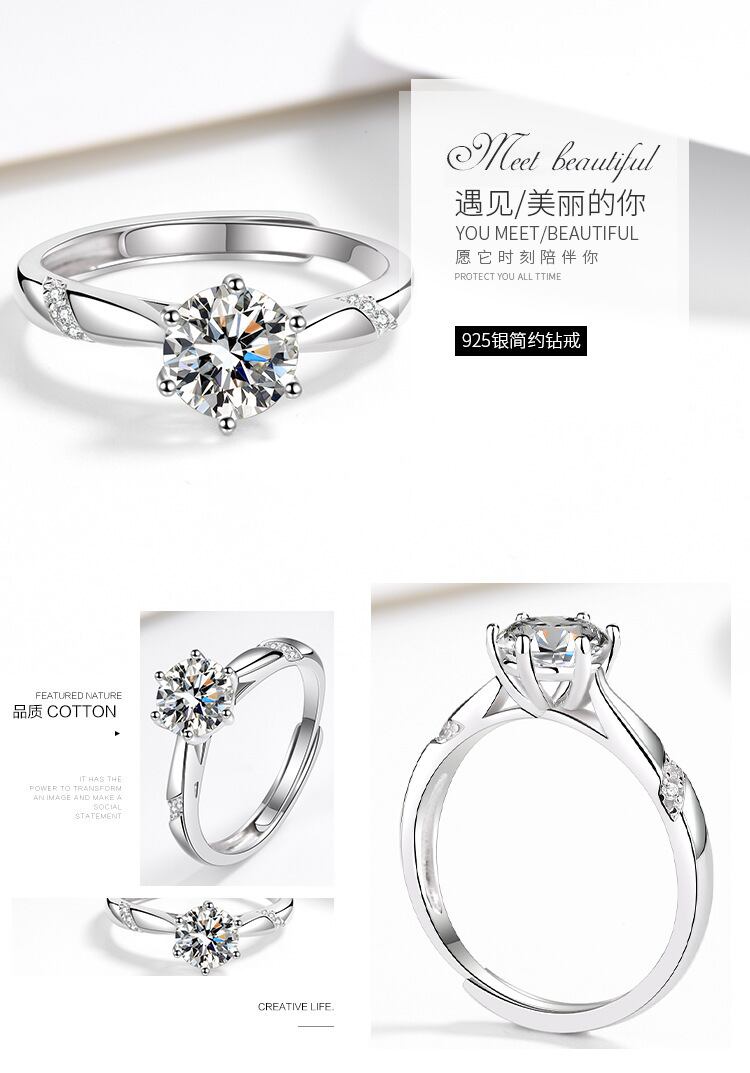 送料無料 S925 スターリングシルバー 6 プロング ダイヤモンド リング 開口部を調節可能 1 カラット ストーン リング サイズ変更可能 アジャスタブル 指輪 銀 AE00870055514108986