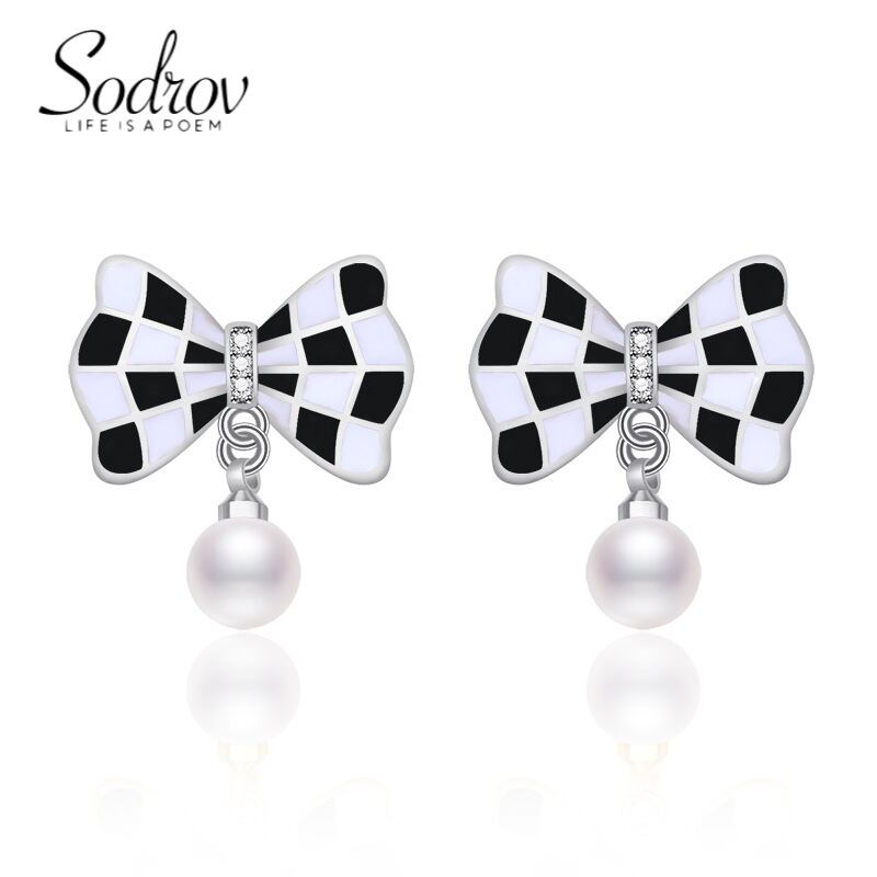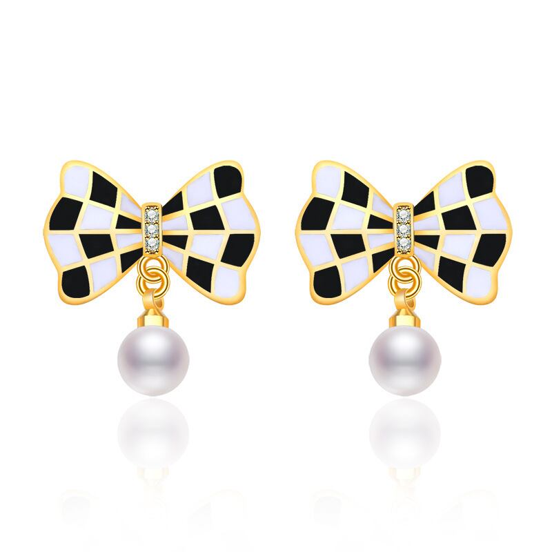 送料無料 SODROV 黒と白の市松模様の弓の真珠のイヤリングジュエリー女性の蝶のイヤリングイヤリングスタッドのイヤリング ホワイト ブラック リボン パール 指輪 AE0087006906350079