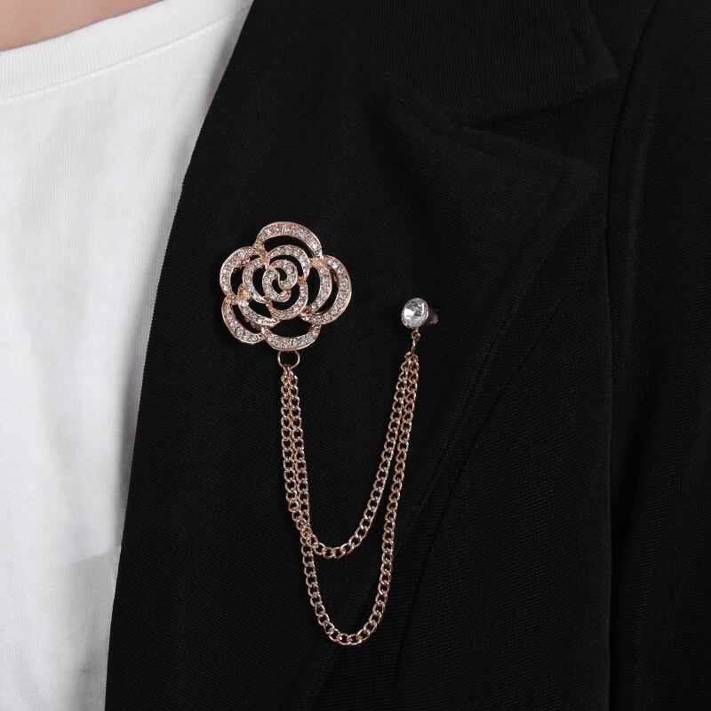 送料無料 金属中空花ローズラペルピンバッジ電話チェーンクリスタルブローチスーツジャケットユニセックスジュエリー フラワーデザイン AE335356629942735937