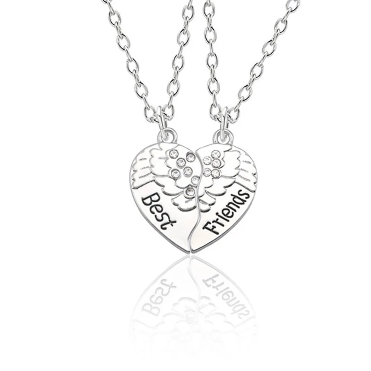 送料無料 ハート形ネックレス ラインストーン ヴィンテージ彫刻翼パターン Kpop 親友ペンダント 2 個セット チェーン スプライシング レース ビンテージ AE335356648247641802