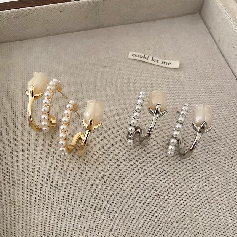 送料無料 チューリップパール二層フープイヤリング女性ロマンチックなフラワーピアスイヤリング 2022 ガールレディパーティージュエリー 真珠 指輪 フラワーデザイン AE88788713195816971