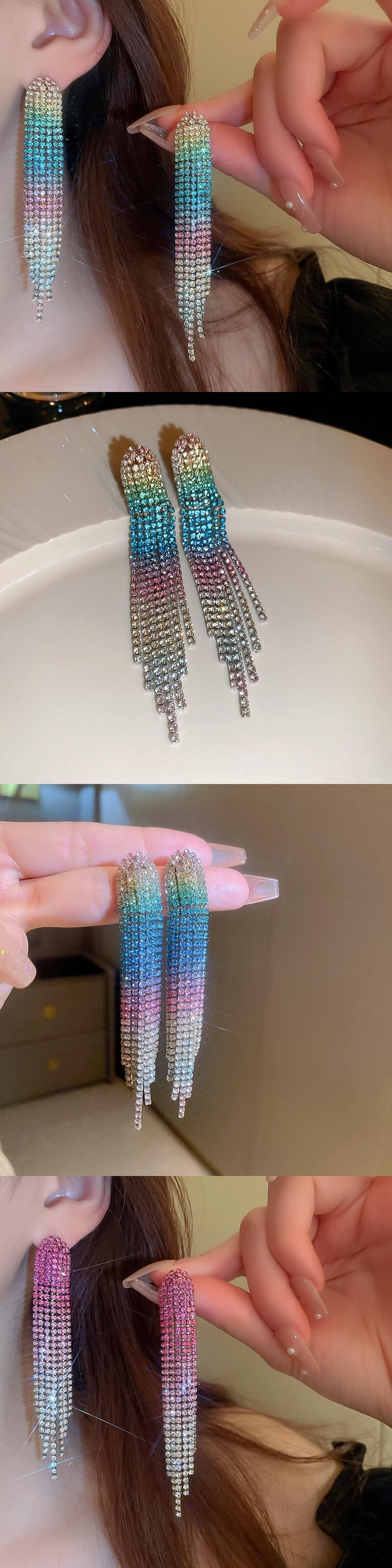 送料無料 カラフルな象嵌ラインストーンロングテルイヤリング女性ステートメントダングルイヤリング 2023 美的アクセサリー 指輪 AE88788718979832347