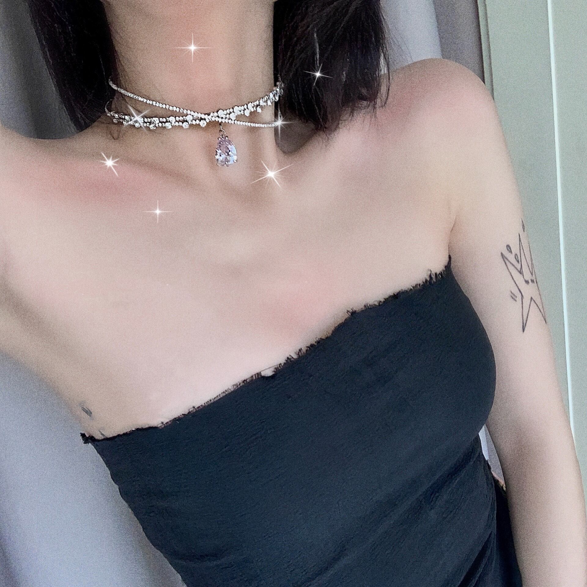 送料無料 KAITIN シンプルなパーソナライズチョーカーヘアクリップダイヤモンドネックリング豪華なウォーターペンダントネックチェーン首飾り 指輪 AE88788764615541485