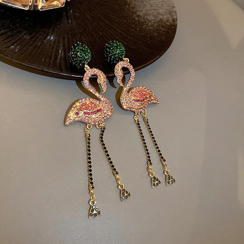 送料無料 高級ピンク鳥フラミンゴブラブライヤリング女性ロングテルラインストーンイヤリング 2022 ステートメントジュエリー 指輪 AE88788788868816096