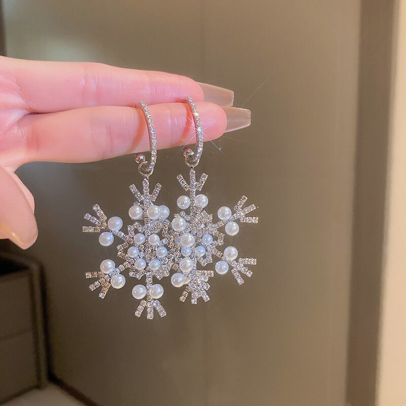送料無料 クリスマス耳ジュエリービッグスノーフレークイヤリング光沢のある象眼細工のラインストーン模擬パールダングルイヤリング 2022 ヨーロッパトレンディ 真珠 指輪 人工 ヨーロピアン AE88788772192326003