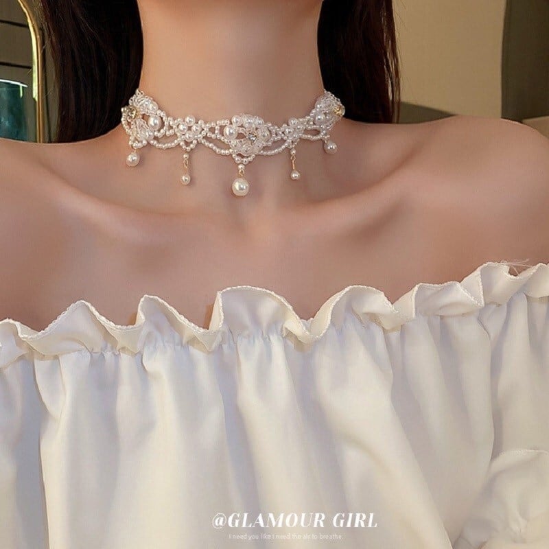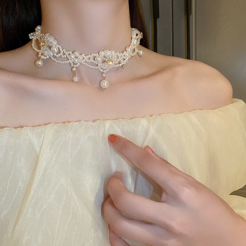 送料無料 ダイヤモンド クリスタル パール フラワー ネックレス レディース フレンチ ロココ 鎖骨チェーン - 品質の軽い高級ネックレス レース ロココ調 真珠 フラワーデザイン AE88788780505514901