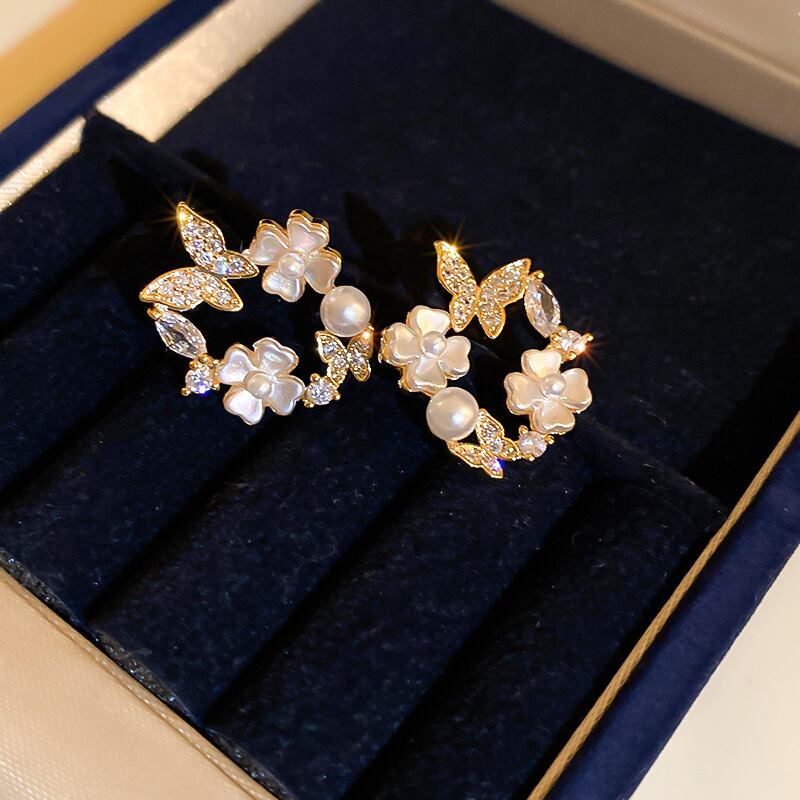 送料無料 KAITIN パールフラワーイヤリング女性 2023 ジルコン蝶ラウンドスタッドイヤリング高級ジュエリー 真珠 指輪 フラワーデザイン AE88788788489860674