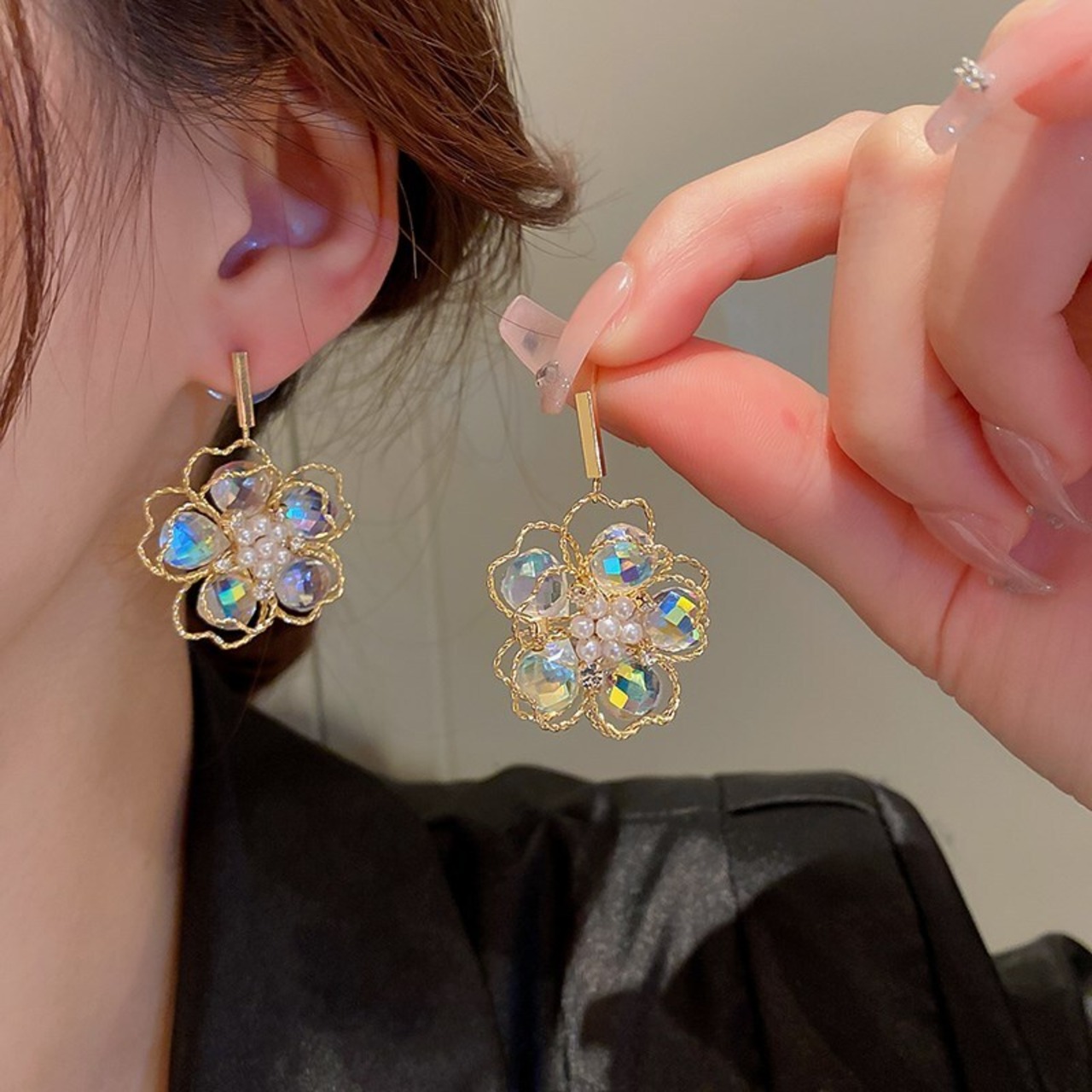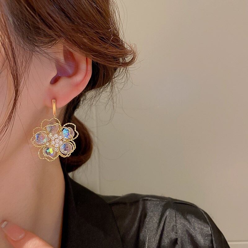 送料無料 ファッション象嵌ダイヤモンドパールクリスタルフラワーイヤリング女性スタイル気質ドロップイヤリング 2022 女性のジュエリー 真珠 指輪 フラワーデザイン AE88788779739487689