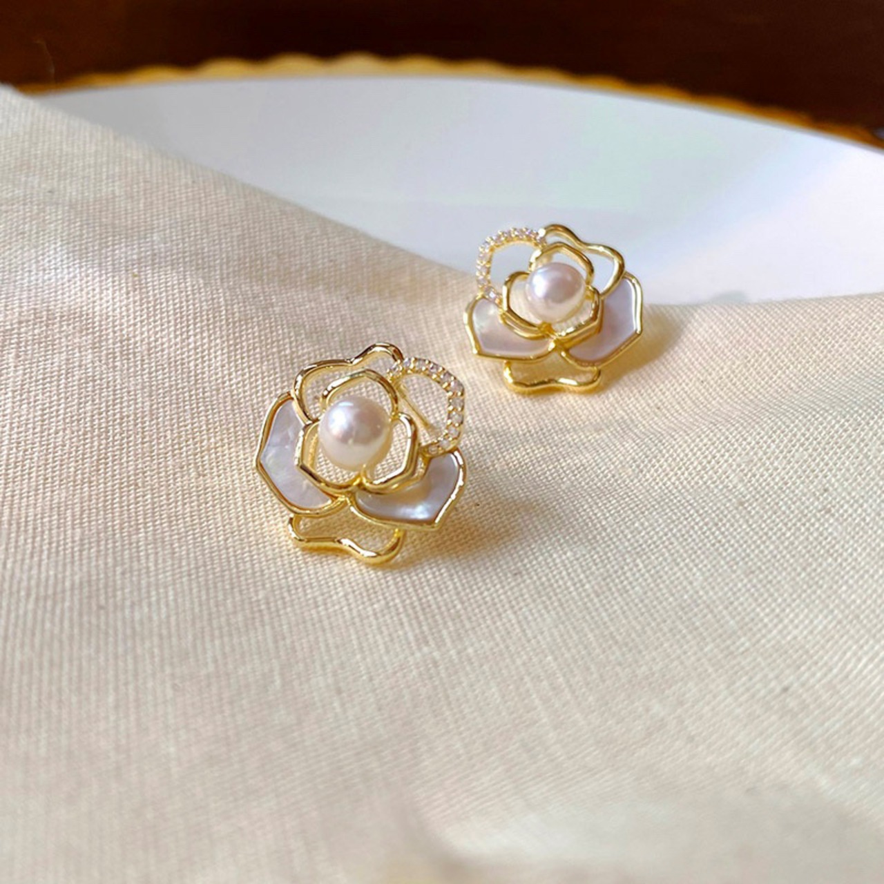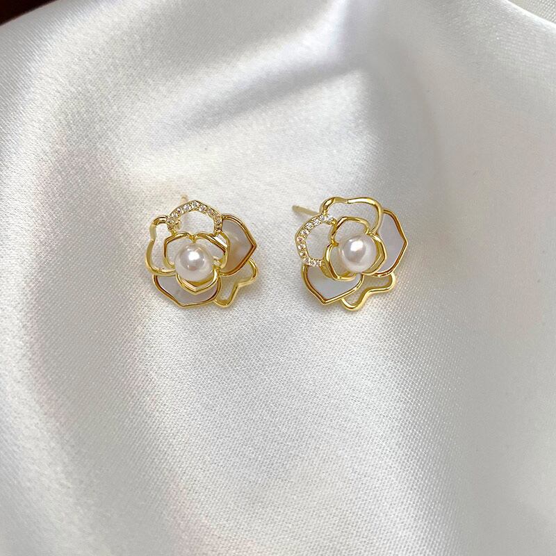 送料無料 KAITIN ジルコン象眼細工の花の女性のイヤリングシンプルなシェルパールイヤリング女性の気質ライト高級アクセサリー 真珠 指輪 フラワーデザイン AE88788755259795919